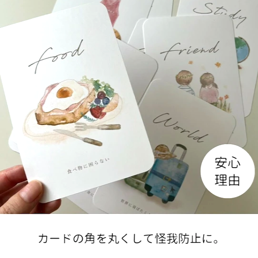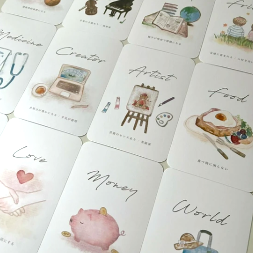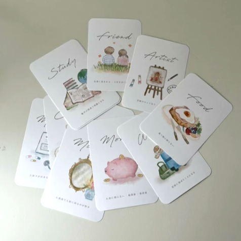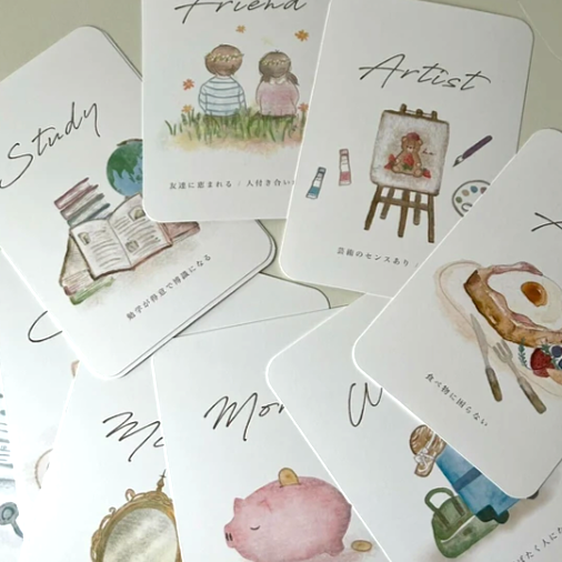 お子さまの1歳の誕生日にやる方も多い、子どもの将来を占う「選び取り」。ボールや電卓など物を用意することも多いですが、最近はスペースや安全性を考えてカードを用意することも。使い終わった後も写真立てやアルバムに綴じて、場所を取らずに思い出として残せるのも嬉しいポイントのひとつです。どのカードを選んでくれるか、ぜひ写真や動画も一緒に撮りながらお楽しみください。