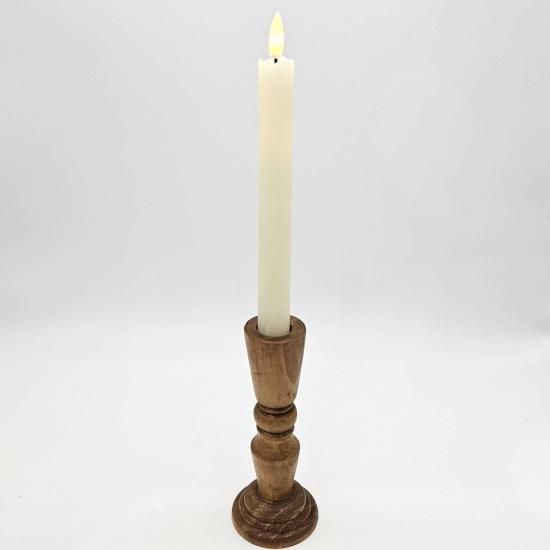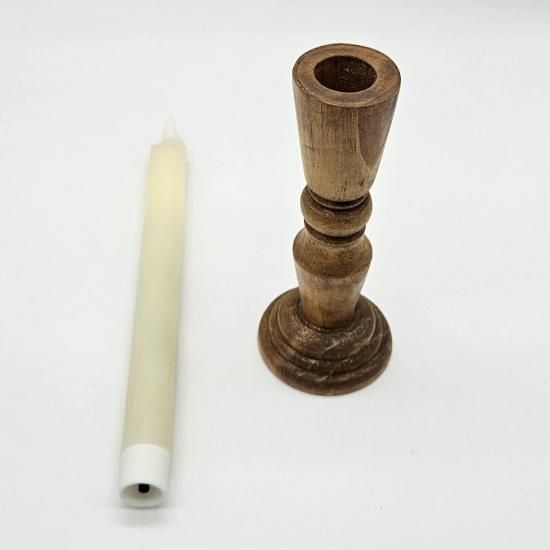 アンティークのような雰囲気のある、木製のスタンドとLEDキャンドルライトのセット。素材には軽いパイン材を使用しており、アンティークのような重厚感を出すために一つ一つ手作業で塗装を行っています。パイン材の自然な風合いがどんなインテリアにも自然に溶け込んでくれます。LEDキャンドルライトは 本物の炎のように心地よく揺らめき、リラックスした空間を演出してくれます。本体の表面は蝋でコーディングされており、表面の凹凸や上面の自然に溶けたようなフォルムがまるで本物のキャンドルのような仕上がりです。火を使わないLEDライトなので、小さなお子様やペットのいる空間でも安心してお使いいただけます。クリスマスシーズンの雰囲気作りや、夜のリラックスタイムなど様々なシーンでお楽しみください。