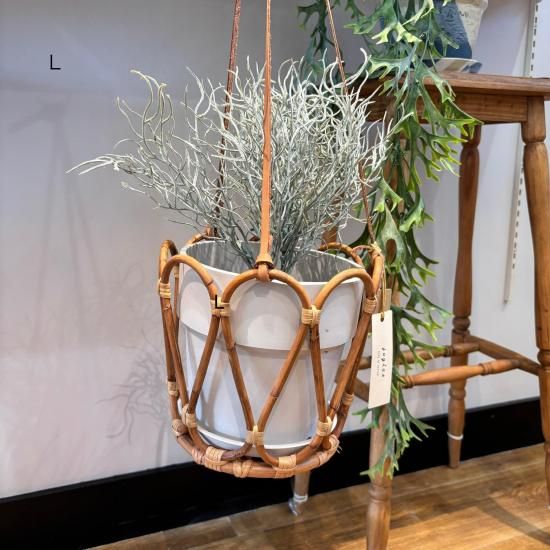 JUGLAS(ユグラ)シリーズにハンギングポットが加わりました。本革紐とラタンの曲線がマッチしたデザインです。皮付きラタンを使用しすべて手作業で作られています。中が見えるデザインなので、中に入れる鉢の色や模様によって印象がガラリと変わります。ハンギングには本革のレザー紐を使用。ラタンと革はどちらも経年変化で色味が深まっていくので、色の変化も合わせて長くお楽しみいただけます。