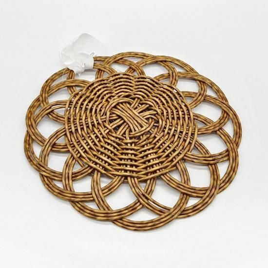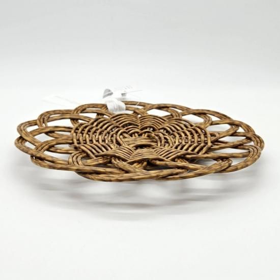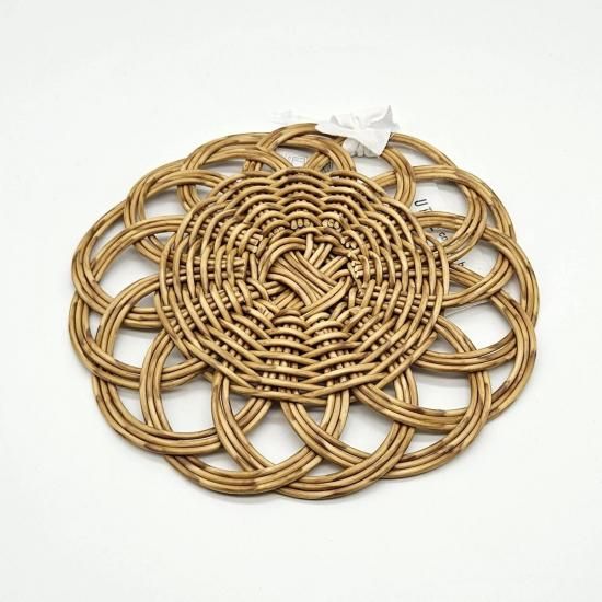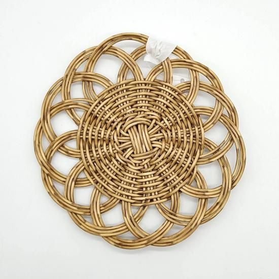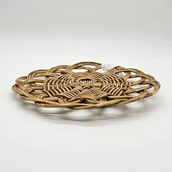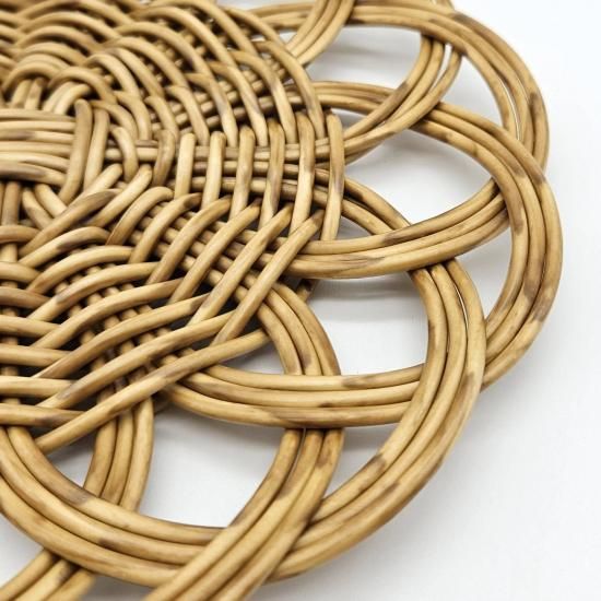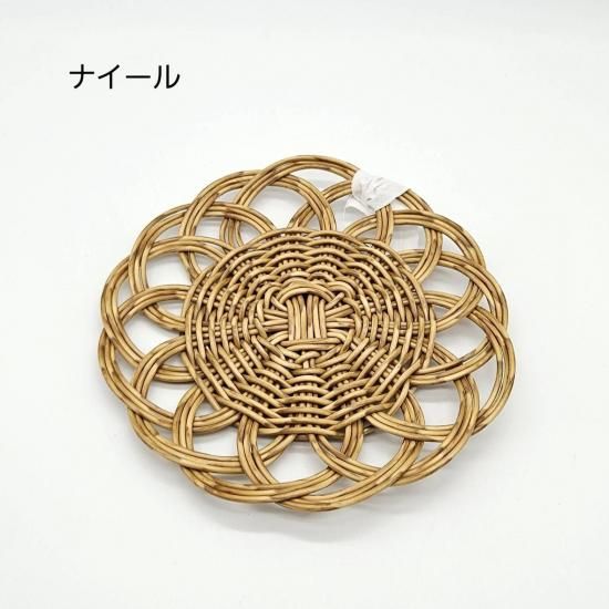 本品は裏面に編み目の段差があるため、乗せるものの大きさによっては不安定になる場合があります。本商品の上にフライパンなど高温のものを置かないでください。素材が溶ける恐れがあります(耐熱温度100℃まで)。火のそばや直射日光の当たる場所、高温になる場所には置かないでください。手編みのため、サイズや形に若干の個体差があります。電子レンジは最大約900wを目安にご使用ください(食洗機・直火・オーブントースター・グリル・ガスオーブン・スチームオーブン・IH・電気調理器はご使用できません)。簡単な汚れは水拭きをおすすめします。洗剤をお使いの際は、中性洗剤をご使用の上、しっかりすすいでください。たわし、クレンザー、漂白剤のご使用はお避けください。