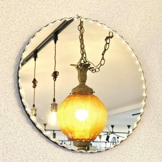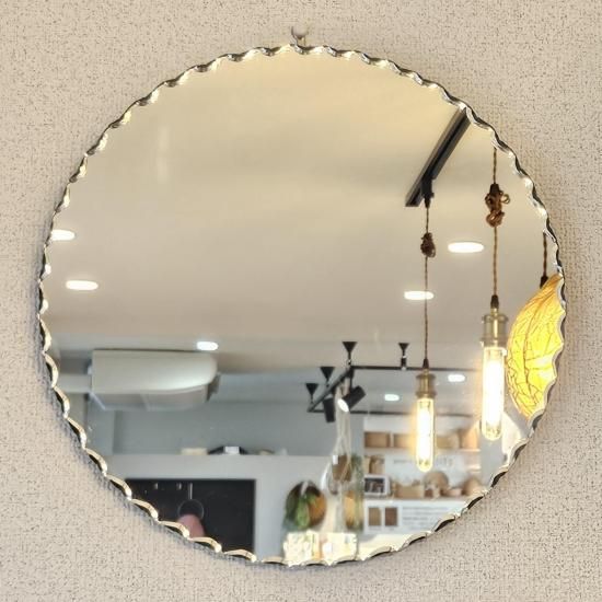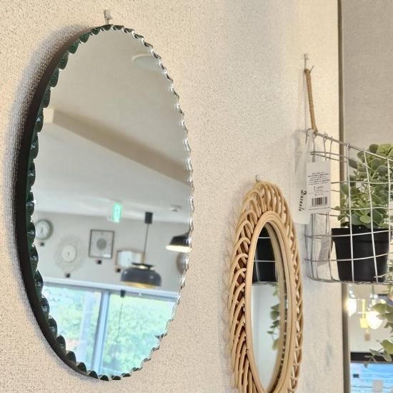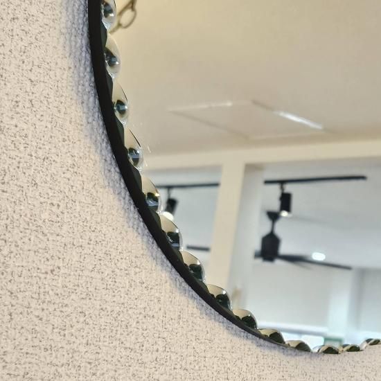 「エッジング」という、鏡に直接カッティングを施し装飾する技法で作った壁付けミラーです。斜め横から見たときに、エッジング部分に反射する光がほのかにきらめきます。こちらのタイプは、細かな波形のエッジング加工により、鏡面サイドに可憐なフリルがついているように見えるのが特徴です。