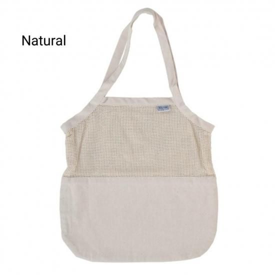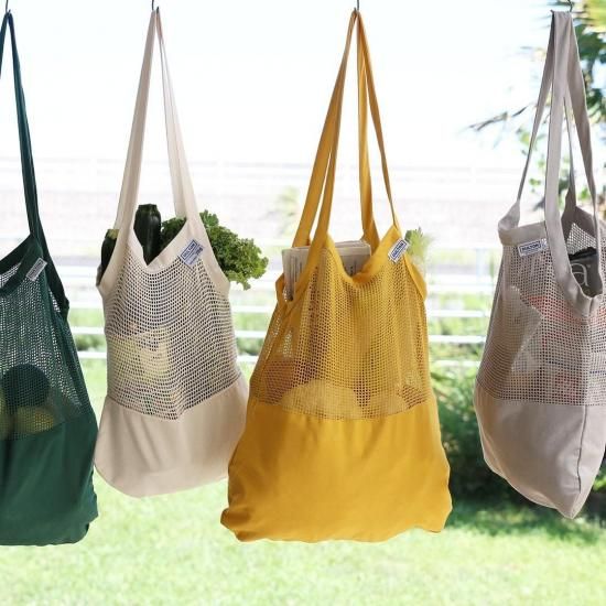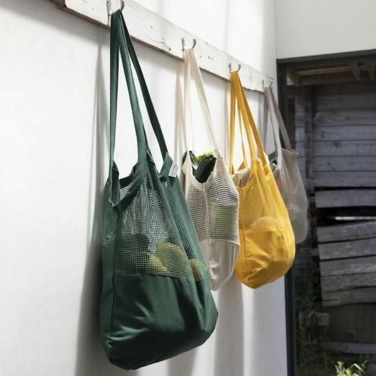 オーガニックコットン素材のメッシュバッグ。コンパクトに折りたためるので、普段のお買い物や旅行時のサブバッグとしてもお使いいただけます。A4サイズ収納可能。S・Lの2サイズ展開でご用意しております。