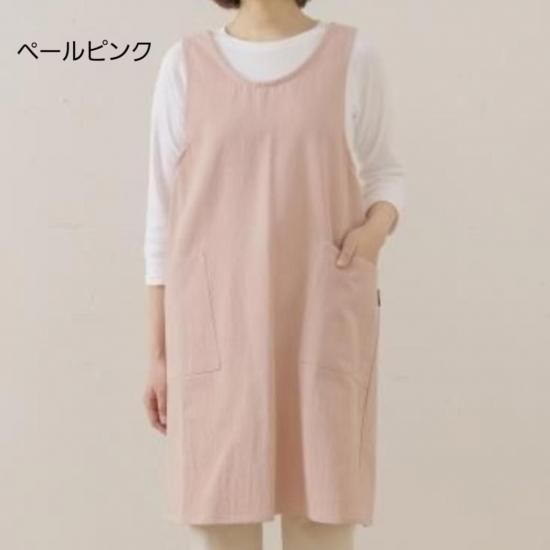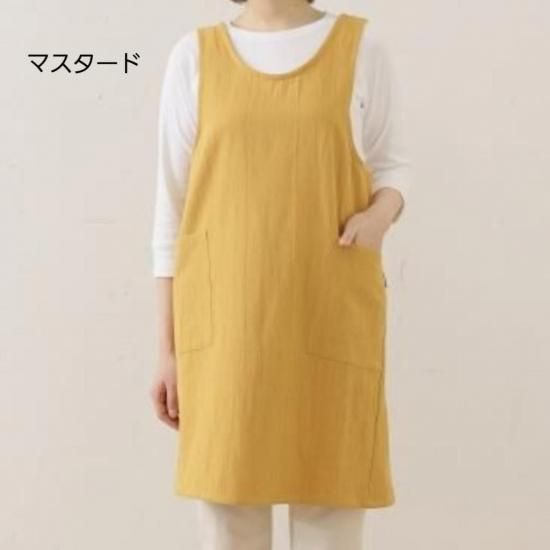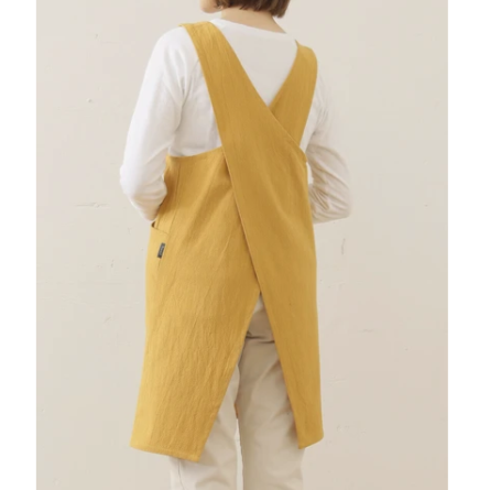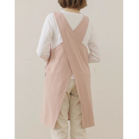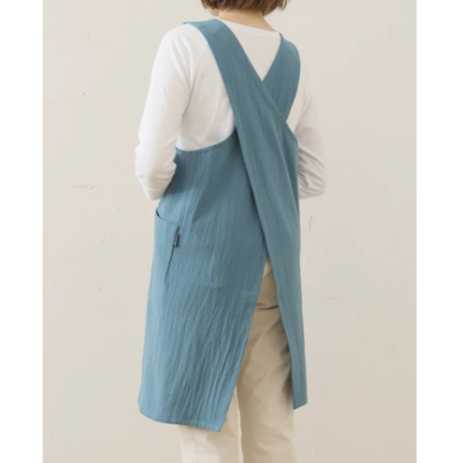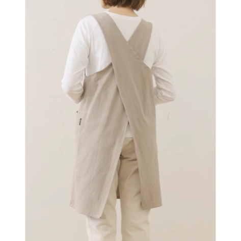 身につけた時のシルエットがきれいなクロスオーバーエプロン。柔らかなウォッシュドコットンの素材感が心地良いワンピースタイプ。
