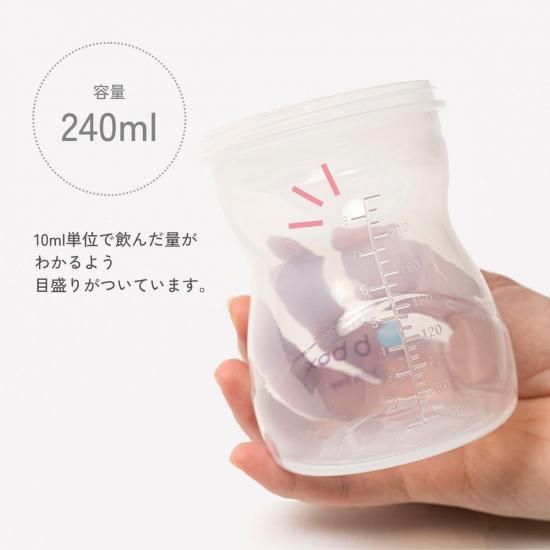 おもりのついたストローがカップをどんな角度で持っても液体と一緒に動く、開け閉めがしやすいスライド式の蓋。カップ部分はトレーニングカップ、スパウトカップの蓋にもフィット。食洗機対応。