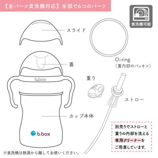 ストローとおもりの中はシッピーカップ専用の「スペアストロー/クリーナーセット」をご使用いただくと中まで洗うことができます。b.boxのシッピーカップを安全に長くご使用いただくために、以下の点にご注意ください。高温多湿な場所や直射日光の当たる場所での保管は避けてください。長期間ご使用になると、素材の経年変化により、漏れや食べかすの逆流を防ぐ機能が低下する場合がございます。ご使用前には必ず各パーツに破損がないかをご確認いただき、適切にお手入れを行ってください。衛生上、また安全にご使用いただくために、定期的なパーツの交換をおすすめいたします。