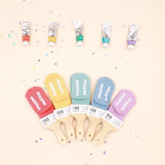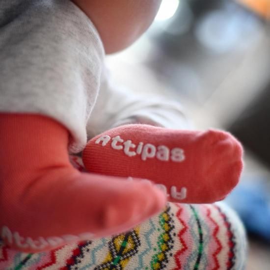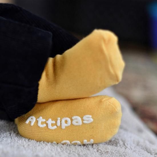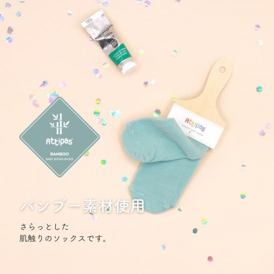 足裏にはAttipasのロゴ模様の滑り止め付きの靴下です。素材にはバンブーを使用し、さらっとした肌触り。赤ちゃんの足を寒さや地面から守ります。5色から選べるカラーソックス。ペンキをモチーフにした可愛いパッケージで、10-12cmサイズのご用意しました。贈り物としてもおすすめです。