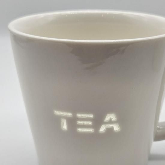 透明な釉薬による「蛍掘り」の技法を使い、文字や絵柄を透かした「透かし」シリーズ。刻まれた文字がアクセントになり、他には無いデザインを楽しめます。「蛍掘り」とは透かし彫りをした作品に、透明釉をかけて焼き上げる技法です。作る工程で器面に穴を開けてから、釉薬で穴埋めをしています。「透かし」シリーズの特徴である浮かびあがるような文字は、こうした伝統技法で作られています。