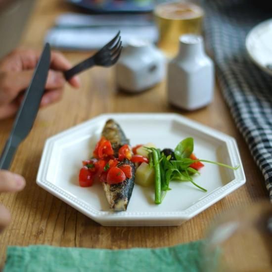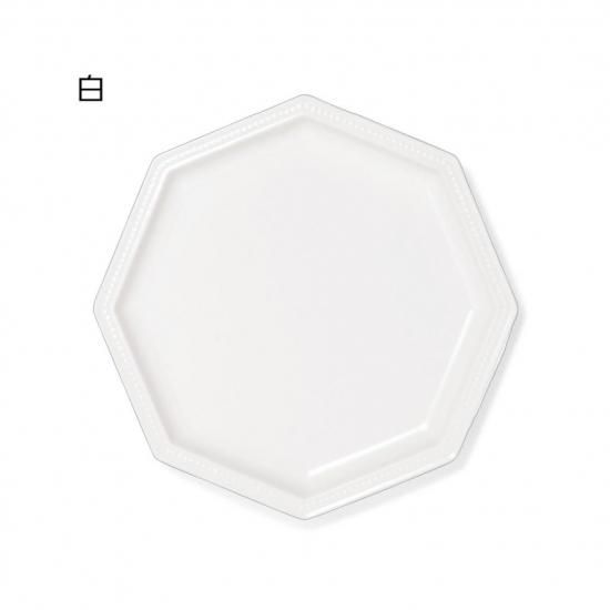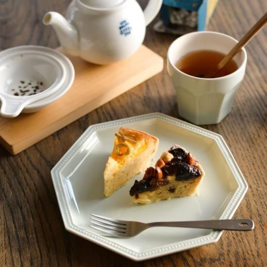 ガティの特徴は縁に施された装飾。細かな凹凸で出来上がったドット柄は、デコレーションされたお菓子のような可愛らしさがあります。アクセントになる八角形は柔らかいラインで作られており、他の丸い器と馴染みやすい形状です。透明感のある釉薬が、ドット状のレリーフに美しい陰影を生み出し、ガティ・プチガティならではの表情を引き立てます。はっきりとした濃淡が生まれることで、シンプルながらも奥行きのある魅力が際立ち、食卓にさりげない華やかさを添えてくれます。盛り面がフラットで、リムにしっかり厚みがあるので持つときに手に取りやすいところも特徴です。額縁効果、重量感があるので、焼き菓子やパンケーキなどが絵になります。お菓子の時間を演出するようにと作られたプレートですが、普段の食事の取り皿にも最適です。和食や中華、エスニックにイタリアンなど様々な食事のシーンで汎用性が高く、印象に残るお皿です。