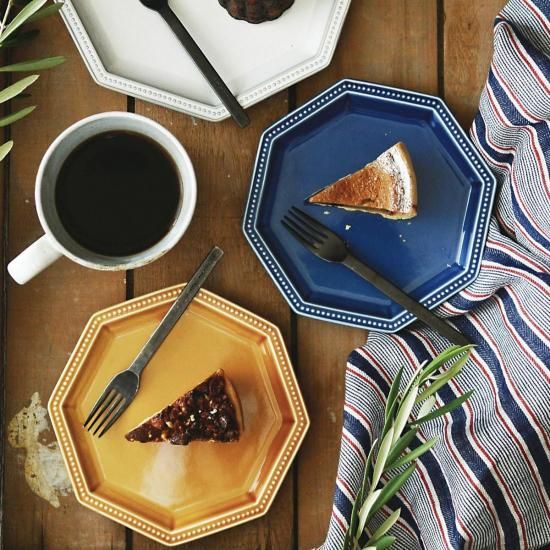 プチガティは取り皿としてより身近で使いやすいサイズ感になっています。八角形のスタイリッシュな形と、縁の可愛らしいドットが絶妙なバランスです。透明感のある釉薬が、ドット状のレリーフに美しい陰影を生み出し、ガティ・プチガティならではの表情を引き立てます。はっきりとした濃淡が生まれることで、シンプルながらも奥行きのある魅力が際立ち、食卓にさりげない華やかさを添えてくれます。盛り面がフラットで、リムにしっかり厚みがあるので持つときに手に取りやすいところも特徴です。額縁効果、重量感があるので、焼き菓子やパンケーキなどが絵になります。お菓子の時間を演出するようにと作られたプレートですが、普段の食事の取り皿にも最適です。和食や中華、エスニックにイタリアンなど様々な食事のシーンで汎用性が高く、印象に残るお皿です。