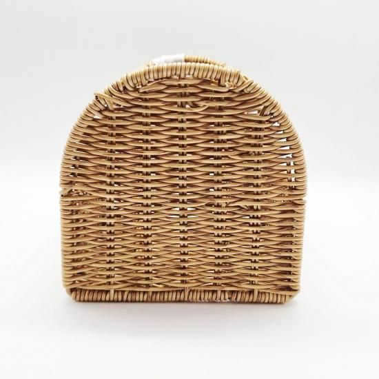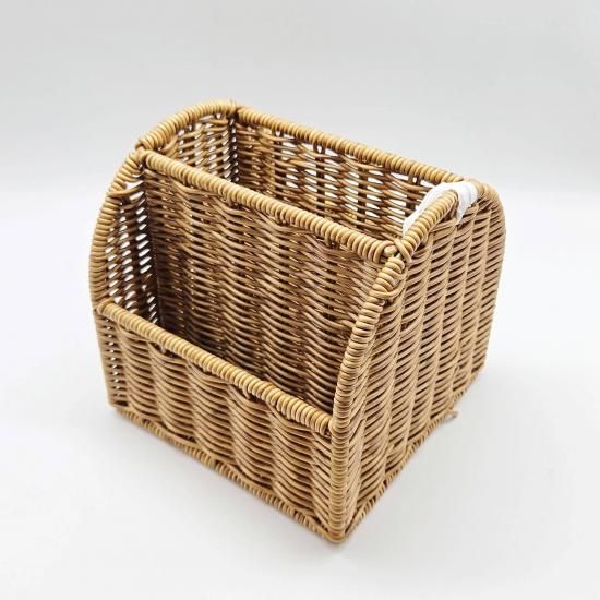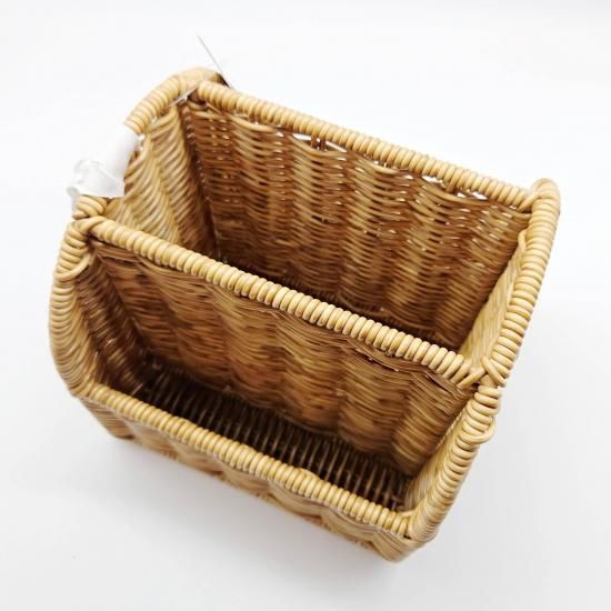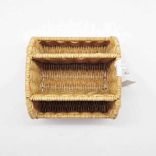 バスケットのようなナチュラルデザインが魅力のリモコンラック。水や汚れに強いPPラタンで編まれており、表と裏どちらからでも取り出しやすいシンメトリーデザインです。2つの仕切りでリモコンはもちろん、文房具やメガネ、ハンドクリーム、スマートフォンや小型のタブレットなど細々としたアイテムも立てて収納できます。洗面所に置いて毎朝の身支度に使うヘアブラシやクリーム、コスメを収納したり、キッチンでは良く使うスパイスやボトル類の収納にもおすすめです。リビングやデスク周りの整理整頓に便利な、ナチュラルな風合いと実用性を両立した収納アイテムです。